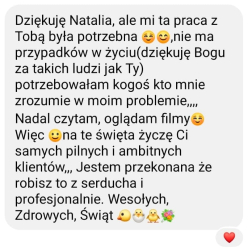 Będą pojawiały się zadania ,,do domu”, aby ćwiczenia z naszych spotkań mogły się utrwalać i wpływać na twoje samopoczucie/zmianę. W razie potrzeby, zawsze możesz się ze mną skontaktować, napisać, zadzwonić. Kiedy pojawi się kryzys będę obok, abyś nie czuł się sam. To buduje relacje i może właśnie dlatego mam kontakt z moimi klientami sprzed lat.